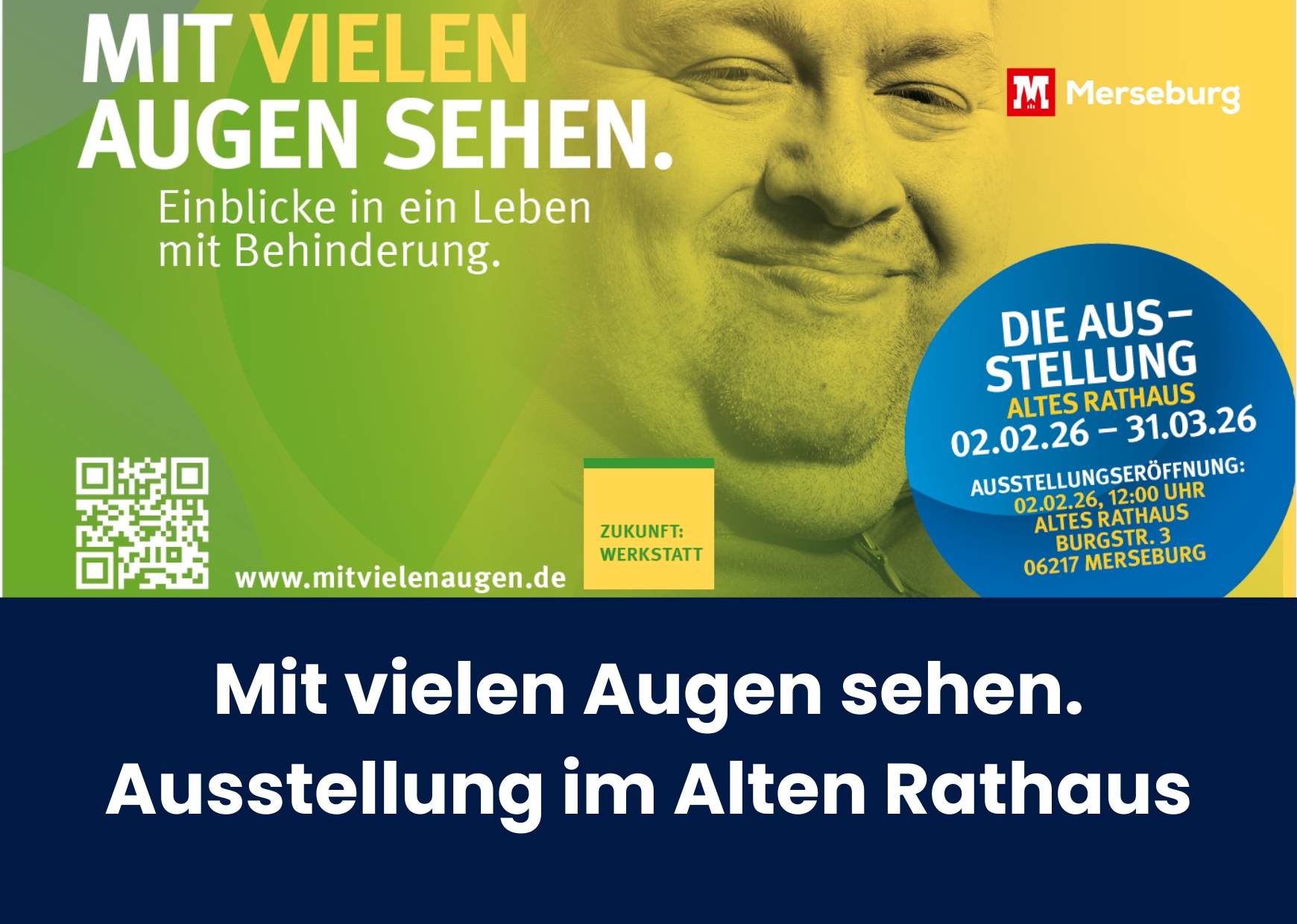 Im dritten Jahr der Wanderausstellung „Mit vielen Augen sehen“ gastiert die Präsentation der Landesarbeitsgemeinschaft Werkstätten für behinderte Menschen Sachsen-Anhalt (LAG WfbM) in Merseburg. Die Schau wird im Alten Rathaus gezeigt, wo sich der Bürgerservice der Stadt, das Einwohnermelde- und Gewerbeamt sowie das Fundbüro befinden. Besucherinnen und Besucher sowie Mitarbeitende können die Ausstellung vom 2. Februar bis 31. März besuchen, Merseburgs Oberbürgermeister Sebastian Müller-Bahr eröffnet sie am 2. Februar um 12.00 Uhr.