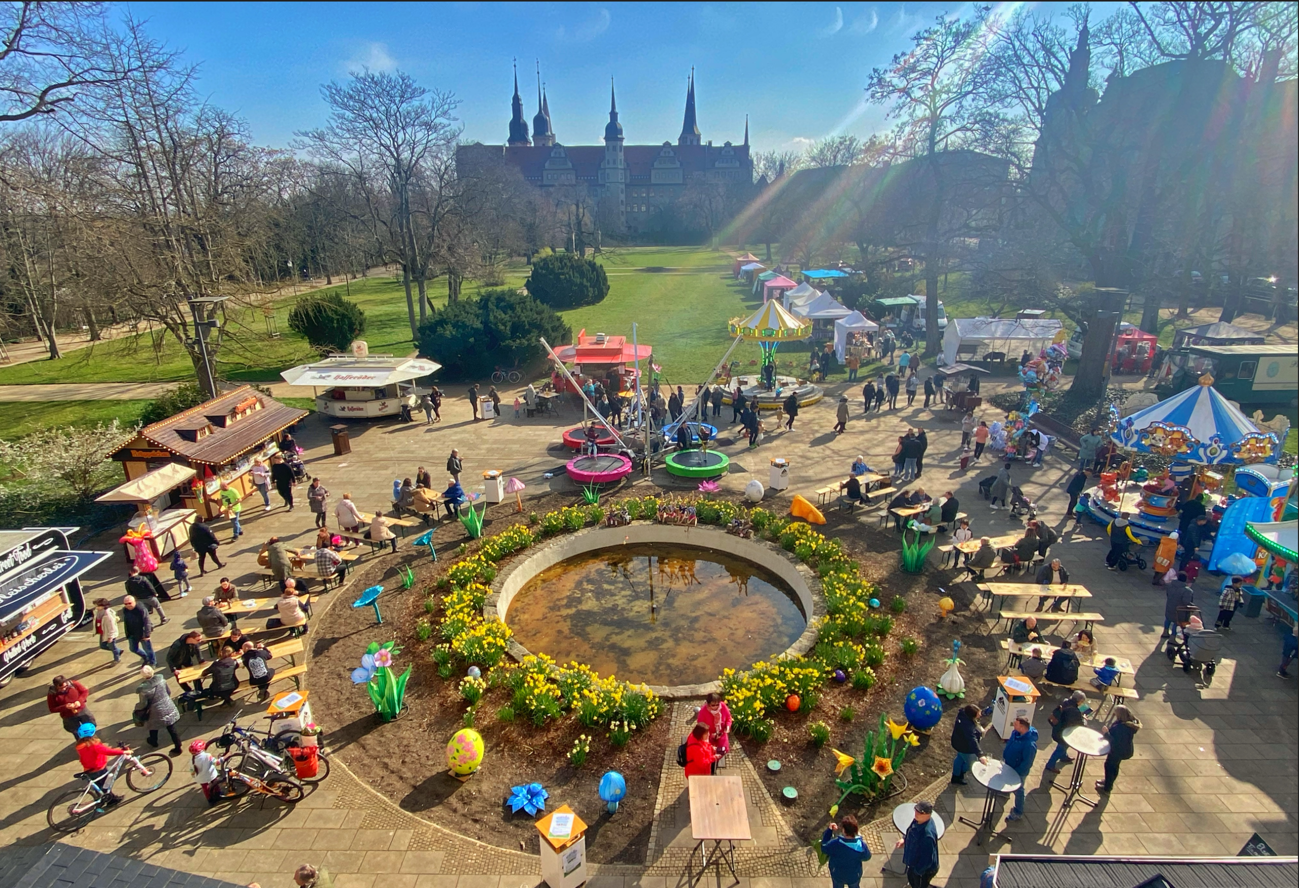 Neben dem lebhaften Markttreiben mit allerlei Gaumenfreuden und bunten Waren erwartet Sie ein entzückender Streichelzoo sowie kreative Bastel- und Mitmachaktionen, die das Osterfest zum Leben erwecken. Wer weiß - vielleicht begegnen Sie bei Ihrem Spaziergang durch den Merseburger Schlosspark sogar dem Osterhasen persönlich!